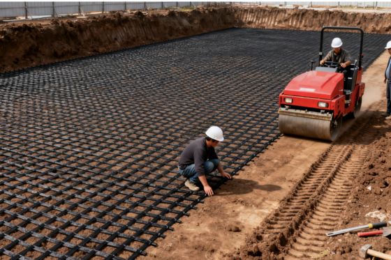 Uniaxial geogrids are placed between soil layers, providing tensile strength in one direction, which helps to reinforce the soil and improve its overall stability.
